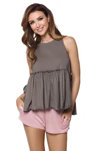 Piżama damska, składająca się z koszulki oraz krótkich spodenek. Koszulka khaki bez rękawków, od połowy odcięcie z falbanką. Spodenki w kolorze brudnego różu...