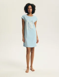 Koszula nocna Estes Henderson | jasny niebieski Koszula nocna Estes Henderson to połączenie komfortu, prostoty i subtelnej estetyki inspirowanej naturą. Jasnoniebieski kolor w zestawieniu z delikatnym, botanicznym nadrukiem nadaje całości świeży, spokojny charakter, idealny na wieczorny i nocny relaks. Luźny, prosty krój oraz krótki rękaw zapewniają swobodę ruchów i wygodę noszenia. Naturalna bawełna sprawia, że koszula jest miękka, oddychająca i przyjemna dla skóry – doskonała zarówno na ciepłe noce, jak i całoroczne użytkowanie. Cechy: koszula nocna o prostym, swobodnym kroju krótki rękaw i okrągły dekolt delikatny nadruk botaniczny z przodu jednolity tył bez zdobień długość przed kolano Skład: