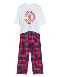 Piżama CandyCane wprowadza do zimowych wieczorów odrobinę świątecznej beztroski. Miękka, przyjemna w dotyku dzianina otula ciało, a luźny krój gwarantuje pełną swobodę ruchów – idealny wybór na leniwe poranki i długie wieczory z kubkiem kakao. Góra w kolorze kremowej bieli ozdobiona jest zabawnym nadrukiem z piernikowym ludkiem i napisem Holly Jolly, który przywołuje ciepło świątecznej atmosfery. Do kompletu dołączono spodnie w klasyczną czerwoną kratę, które wnoszą do stylizacji nutę retro i domowego uroku. To piżama, która łączy wygodę z odrobiną świątecznego nastroju – idealna n