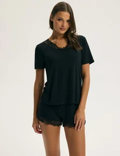 Canti to piżama, w której klasyczna czerń spotyka się z delikatnym, kobiecym detalem. Głęboki kolor nadaje całości elegancki charakter, a subtelne koronkowe wykończenia przy dekolcie i nogawkach wprowadzają nutę zmysłowości, nie tracąc przy tym lekkości i komfortu. To komplet stworzony z myślą o wieczornym wyciszeniu i chwilach relaksu, które zasługują na odrobinę luksusu. Piżama została wykonana z wiskozowej dzianiny z dodatkiem elastanu, która jest wyjątkowo miękka, oddychająca i przyjemna dla skóry. Koszulka z krótkim rękawem ma luźny, komfortowy krój, który delikatnie opływa sylwetkę i zapewnia swobodę ruchów.