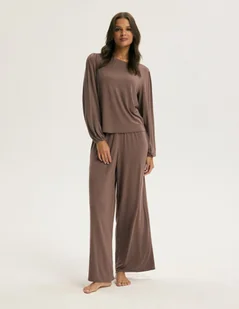 Cechy produktu: Damski komplet loungewear / piżama 2-częściowa Skład materiału: 95% wiskoza, 5% elastan – miękka i oddychająca dzianina Góra z długim rękawem i romantycznymi marszczeniami Prosty, wygodny fason bluzy Długie spodnie o prostym kroju Szeroki, elastyczny pas dla komfortowego dopasowania Elegancki, brązowy kolor Idealny na chłodniejsze wieczory i poranki