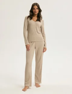 Beżowa wersja Cori stawia na subtelność i naturalną lekkość. Jasny, neutralny kolor rozświetla sylwetkę i nadaje całości świeżego, ponadczasowego charakteru. To piżama, która doskonale odnajduje się w domowej codzienności – dyskretna, estetyczna i niezwykle komfortowa. Delikatna dzianina z bawełny i wiskozy miękko układa się na ciele, zapewniając komfort termiczny i swobodę ruchów. Góra z długim rękawem i dekoltem zapinanym na guziki łączy funkcjonalność z kobiecym detalem, a długie spodnie o prostym kroju dopełniają zestaw w duchu wygody i naturalnego luzu.