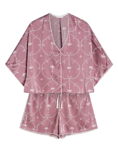 Piżama Cosmati w odcieniu przygaszonego różu otula ciało subtelnym połyskiem tkaniny, która mieni się niczym poranna mgła w pierwszym świetle dnia. Krótszy krój spodenek odsłania nogi z wdziękiem, a koszulowa góra z eleganckim kołnierzykiem i perłowym zapięciem wprowadza nutę klasycznego szyku. Dekoracyjny nadruk o delikatnym, roślinnym rytmie rozświetla powierzchnię materiału, nadając jej miękkiego blasku. To piżama, która łączy wygodę letniego snu z kobiecą finezją – idealna, by poczuć się lekko i zmysłowo. krótkie spodenki z elastycznym pasem i wiązaniem
