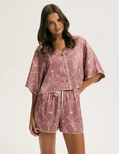 Jasnoróżowa wersja piżamy Cosmati odsłania bardziej delikatne, romantyczne oblicze tego modelu. Satynowy materiał pięknie odbija światło, a pastelowy odcień różu dodaje całości lekkości i świeżości. Jasny nadruk harmonijnie współgra z kolorystyką, tworząc spójny, kobiecy zestaw idealny na letnie noce i spokojne poranki. Koszulowa góra z krótkim rękawem i ozdobnymi, połyskującymi guzikami nadaje piżamie elegancki charakter, zachowując przy tym pełną swobodę noszenia. Szorty z elastycznym pasem gwarantują wygodę i lekkość, pozwalając skórze oddychać.