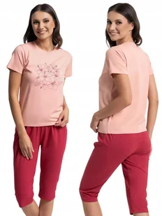 Piżama damska bawełniana dwuczęściowa z kwiatowym nadrukiem RÓŻOWY MORAJ ➡️ Ta damska piżama dwuczęściowa to wygodna i kobieca propozycja do codziennego wypoczynku. Wykonana z dzianiny zawierającej 95% bawełny i 5% elastanu, jest miękka, oddychająca i przyjemna dla skóry, a jednocześnie elastyczna, dzięki czemu dobrze dopasowuje się do sylwetki i nie krępuje ruchów. ➡️ Koszulka z krótkim rękawem została uzupełniona delikatnym nadrukiem, który nadaje całości lekkości i subtelnego charakteru. Spodnie o długości 3/4 z elastycznym pasem zapewniają komfort noszenia zarówno podczas snu, jak i w trakcie domowego relaksu. To praktyczny zestaw, który łączy naturalny materiał z dopracowaną formą.