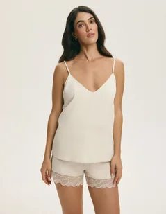 Krótkie szorty z elastyczną talią gwarantują komfort noszenia, a ich nogawki wykończone są delikatną, falującą koronką, dodającą całości lekkości i romantycznego wyrazu. Cechy produktu dwuczęściowa piżama w jasnym, beżowym kolorze luźny top na cienkich, regulowanych ramiączkach głęboki dekolt na plecach krótkie szorty z elastyczną gumą w pasie nogawki wykończone subtelną koronką Skład 100% wiskoza Rozmiary S–XL