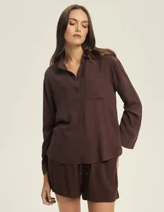 W ciemnobrązowej odsłonie piżama damska Corenso nabiera wyjątkowo przyjemnego, otulającego wyrazu. Kolor inspirowany kawą i naturalnymi odcieniami ziemi wprowadza atmosferę spokoju i relaksu. To komplet, który sprzyja zwolnieniu tempa – idealny na wieczorny odpoczynek i leniwe poranki. Naturalna 100% wiskoza miękko opływa ciało, zapewniając komfort nawet przy dłuższym noszeniu. Koszula z długim rękawem, luźnym krojem i klasycznym zapięciem na guziki emanuje niewymuszoną elegancją, a szorty z elastyczną talią i wiązaniem dopełniają całość w duchu codziennej wygody.