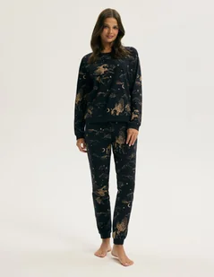 Piżama Craco w wersji z długim rękawem tworzy nastrój wieczornego wyciszenia, jak spokojny spacer pod rozgwieżdżonym niebem. Granatowe tło wypełnione baśniowym motywem gwiazd, księżyców i mitycznych pegazów wprowadza element poezji i subtelnej fantazji, zachowując przy tym elegancki, kobiecy charakter. To piżama zaprojektowana z myślą o chwilach, gdy odpoczynek staje się małym rytuałem. Komplet został wykonany z 100% bawełnianej dzianiny, która jest miękka, oddychająca i przyjemna w dotyku. Bluza o klasycznym kroju z długim rękawem zapewnia komfort termiczny, a spodnie zakończone mankietami dobrze układają się na sylwetce i nie podwijają się podczas snu.