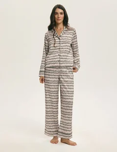 Spodnie o prostych nogawkach posiadają elastyczną talię, która dopasowuje się do figury, zapewniając wygodę zarówno podczas snu, jak i domowego relaksu. Cechy produktu długi komplet: koszula + spodnie miękka, lekko elastyczna satyna z delikatnym połyskiem abstrakcyjny print w odcieniach beżu i brązu koszula zapinana na guziki, z kołnierzykiem dekoracyjna lamówka przy kołnierzu, rękawach i nogawkach spodnie z elastyczną gumą w pasie Skład 97% poliester 3% elastan Rozmiary S–XL