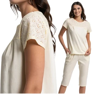 Delikatna, stonowana kolorystyka działa kojąco i relaksująco, pomagając wyciszyć się przed snem. Dlaczego to idealny wybór dla Ciebie? Piżama Moraj z haftem angielskim to propozycja dla kobiet, które nawet w domowym zaciszu chcą czuć się elegancko. Połączenie funkcjonalnych spodni 3/4 z romantyczną górą sprawia, że jest to zestaw niezwykle uniwersalny. Wysoka jakość bawełny gwarantuje, że piżama zachowa swoją miękkość i pastelowy blask przez długi czas, stając się Twoim ulubionym strojem na dobranoc. Rozmiar: L Skład materiałowy: