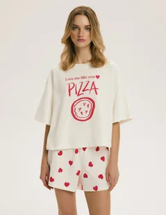 Piżama damska Happiness Bloovii | kremowy, czerwony Zabawna, lekka i pełna uroku – ta krótka piżama to idealny wybór dla miłośniczek wygody z nutą humoru. Kremowa koszulka o luźniejszym, pudełkowym fasonie została ozdobiona wyrazistym nadrukiem w czerwonym kolorze z motywem pizzy i hasłem w walentynkowym klimacie. Subtelny napis umieszczony z tyłu przy karku stanowi ciekawy detal, który dopełnia całość. Do kompletu dołączone są krótkie spodenki pokryte czerwonym printem w serca. Swobodny krój oraz elastyczna talia zapewniają komfort i dopasowanie bez ucisku.
