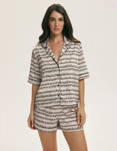 Szorty z elastyczną talią dobrze dopasowują się do sylwetki, a dekoracyjne przeszycie przy nogawkach stanowi estetyczne dopełnienie kompletu. Cechy produktu krótki, dwuczęściowy komplet koszulka zapinana na guziki z kołnierzykiem krótkie rękawy z ozdobnym wykończeniem szorty na wygodnej gumie w pasie kontrastowe lamówki podkreślające linię fasonu abstrakcyjny wzór w beżowo-brązowej tonacji lekko połyskująca, przyjemna w dotyku tkanina Skład 97% poliester, 3% elastan Rozmiary S–XL