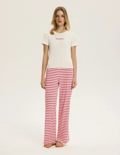 Piżama damska Obsession Bloovii | kremowy, czerwony Model Obsession Bloovii to harmonijne połączenie klasycznej formy i subtelnych, kobiecych detali. Kremowa koszulka z krótkim rękawem została wykonana z miękkiej, prążkowanej dzianiny, która delikatnie otula sylwetkę i zapewnia swobodę ruchów. Centralnie umieszczony haft z napisem dodaje całości charakteru, a falujące wykończenie u dołu wprowadza lekko romantyczny akcent. Spodnie w czerwone paski tworzą efektowny kontrast z górą zestawu. Długi, lekko rozszerzany krój nogawek sprawia, że model prezentuje się lekko i nowocześnie.