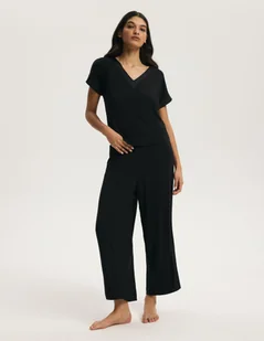 W komplecie znajdują się szerokie spodnie typu kuloty o prostej, luźno opadającej nogawce. W pasie zastosowano elastyczną gumę oraz satynowy detal, który podkreśla dopracowane wykończenie modelu. To piżama, która sprawdzi się nie tylko do snu, ale również jako stylowy homewear na spokojne wieczory w domu. Cechy produktu miękka, elastyczna dzianina z wysoką zawartością wiskozy top z dekoltem V i krótkim rękawem satynowe wykończenia przy dekolcie i rękawach szerokie spodnie o prostej nogawce (kuloty) elastyczny pas z satynowym akcentem elegancki, minimalistyczny fason Skład 95% wiskoza, 5% elastan Rozmiary S–XL
