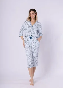 Eleganckie wykończenia (piping) Kobieca stylistyka Miękka i przewiewna tkanina Model dostępny w wielu kolorach lub wzorach Model z kieszeniami Ozdobna kokarda Pakowany w woreczek foliowy Przewiewna dzianina/tkanina Rękaw 3/4 Spodnie typu 3/4 W pasie gumka W pasie ozdobna kokardka Zapinana na guziki Bawełna: 100%