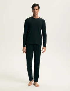 Czarna wersja Axiom to propozycja dla mężczyzn, którzy preferują wyrazisty minimalizm i ponadczasowy styl. Głęboka czerń podkreśla elegancki charakter piżamy, czyniąc ją nie tylko praktycznym zestawem nocnym, ale również estetycznym elementem domowej garderoby. Dzięki zastosowaniu modalu, bawełny i elastanu, komplet jest lekki, elastyczny i wyjątkowo komfortowy. Długi rękaw i pełna długość spodni zapewniają ochronę przed chłodem, a jednocześnie nie obciążają sylwetki. To piżama, która dobrze dopasowuje się do ciała i wspiera naturalny rytm odpoczynku.