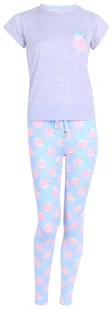 Dwuczęściowa piżama składająca się z szarej koszulki na krótki rękaw oraz długich, dopasowanych spodni. Koszulka jest ozdobiona motywem brzoskwini. Błękitne ...