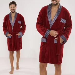 Szlafrok Męski De Lafense Welurowy Do Kolan Z Kieszeniami Elegancki Bordowy 772 Bordowy 3XL Ekskluzywny szlafrok męski De Lafense w kolorze bordowym to połączenie klasy, wygody i doskonałej jakości wykonania. Wykonany z miękkiego, przyjemnego w dotyku weluru, zapewnia pełen komfort i ciepło po kąpieli lub w domowym relaksie. Kontrastowe lamówki i detale z geometrycznym wzorem dodają mu elegancji i wyjątkowego charakteru, idealnego dla nowoczesnych mężczyzn. PARAMETRY I NAJWAŻNIEJSZE INFORMACJE: Kolor: głęboki bordowy – elegancki i ponadczasowy Materiał: