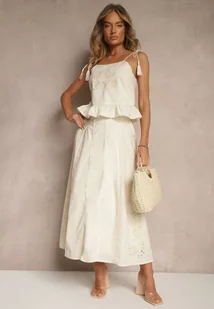 Beżowa Rozkloszowana Spódnica z Bawełny z Haftowanymi Detalami Tolanisse