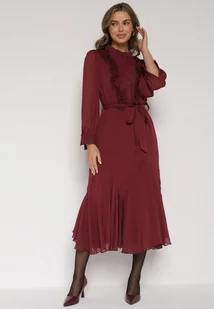 Bordowa Elegancka Sukienka z Bufiastymi Rękawami i Koronkowymi Falbankami Sewlina