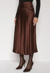 Brązowa Rozkloszowana Midi Spódnica Satynowa Zapinana na Suwak z Gumką w Pasie Williwarne