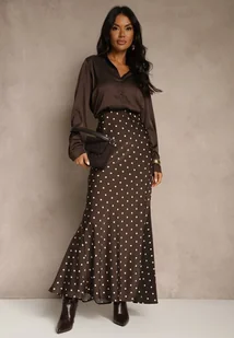 Brązowa Spódnica High Waist w Kropki o Trapezowym Kroju Ravea