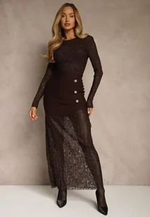 Brązowa Spódnica z Dzianiny z Wiskozą z Koronkowym Dołem Zdobiona Guzikami Sewune