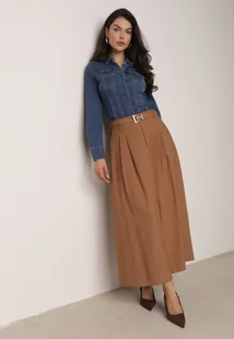 Brązowa Wiskozowa Spódnica o Rozkloszowanym Kroju z Rozcięciem i Paskiem Jaelia