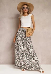 Czarna Bawełniana Spódnica Maxi z Troczkiem i Printem w Kwiaty Yibji
