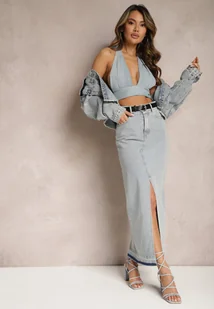 Jasnoniebieska Ołówkowa Spódnica Jeansowa z Ozdobnym Rozcięciem Lefrana