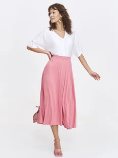 Spódnica damska Top Secret elegancka z efektownym plisowaniem. Przepełniona niecodzienną elegancją oraz wielce wysublimowanym stylem spódnica damska o długości za kolano w trapezowym kształcie, dodającym jej lekkości oraz zwiewności. Posiada ona efektowne plisowanie na całości oraz szeroką i praktyczną gumkę w talii, która podkreśla smukłość kobiecej sylwetki. Wykonana ona została z delikatnej oraz miłej w dotyku dzianiny, sprawdzając się zarówno w połączeniu z klasycznym sportowym T-shirtem, jak i również elegancką damską bluzką. Spódnica damska dostępna w kolorze jasnego różu TSKS25SPC198138X00.