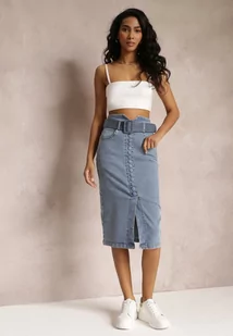 Niebieska Jeansowa Spódnica Ołówkowa Midi z Guzikami i Rozcięciem Jackiesa