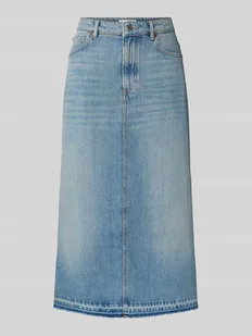 Spódnica jeansowa damska od Marc O'Polo;Efekt: Denim;Krój: rozkloszowana;Długość: Długość midi;Aplikacja: Naszywka z etykietą, nity;Detale: Szlufki na pasek;Dół: surowe wykończenie;Kieszenie: 5 kieszeni;Materiał: czysta bawełna
