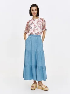 Spódnica damska dostępna w kolorze niebieskim TSKL25SPC001755X00. Modelka ma 177 cm wzrostu i prezentuje rozmiar 34.
