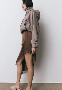 Spódnica midi ze średnim stanem, wykonana z tkaniny o efekcie satyny. Asymetryczny dół z koronkowym wykończeniem. Dostępna w różnych kolorach.