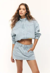 Jeansowe spódnicospodenki mini ze średnim stanem, szlufkami, kieszeniami z przodu, kieszeniami naszytymi z tyłu. Z przodu zapięcie na suwak oraz metalowy element.