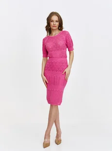 Spódnica damska dostępna w kolorze różowym TSKL25SPC001438X00. Modelka ma 177 cm wzrostu i prezentuje rozmiar 34.