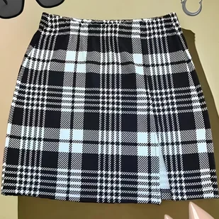 TEMU Elegancka damska spódnica z wysokim stanem w kratkę - czarno-biała kratka, krótka długość, bez paska, idealna na wiosnę/jesień, stylowa odzież