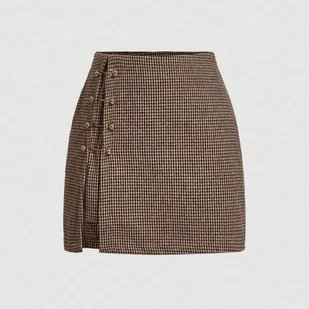 TEMU Krótkie spódnico damska, idealne na jesień i zimę, z krótkim stanem i nadrukiem w kratę, metalowe guziki boczne, doskonała na codzienne wyjścia