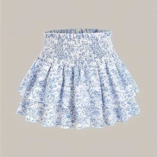 TEMU Spódnica damska z kwiatowym nadrukiem, krótka sukienka z poliestru, luźny krój, marszczony pas, bez paska, na każdą porę roku, falbaniasty dół,