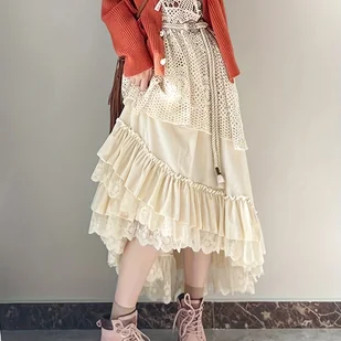 TEMU Spódnica A-Line z Koronką i Aksamitem dla Kobiet, Wiosna/Jesień, Spódnica Rozkloszowana o Średniej Długości, Spódnica Fairy Cake, Nowy Styl 2025