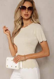 Beżowa Dzianinowa Bluzka z Nieregularnymi Krawędziami Datria