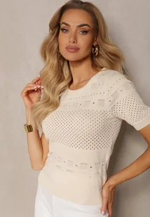Beżowa Ażurowa Bluzka z Krótkim Rękawem Alirada