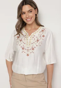 Biała Bawełniana Bluzka z Haftowanymi Zdobieniami Przy Dekolcie Mirundria
