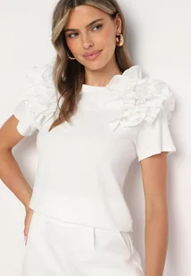 Biały Bawełniany T-shirt Koszulka z Krótkim Rękawem Ozdobiona Aplikacją z Falbankami Aristine