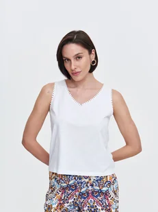 Bluzka damska Top Secret z efektownym koronkowym obszyciem. Urzekająca prostotą oraz dużym komfortem podczas codziennego użytkowania, bluzka damska o swobodnym prostym kroju z delikatnym przeszyciem u dołu. Jest ona w wersji bez rękawów na szerokich ramiączkach i ma efektowny dekolt w serek, a uroku dodają jej delikatne koronkowe obszycie wokół rękawów oraz dekoltu oraz wykonanie z przyjemnej w dotyku oraz dobrej gatunkowo tkaniny bawełnianej. Może być ona z powodzeniem wykorzystana zarówno jako element letniej stylizacji do pracy, jak i też podczas wakacyjnych podróży. Bluzka damska dostępna w kolorze białym TSKL25BLK003900X00.