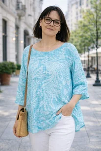 Bluzka damska oversize Włoska 100% bawełna turkusowo biała boho kwiaty Bluzka Damska Oversize Włoska 100% Bawełna Turkusowo Biała boho Kwiaty Ta turkusowo-biała bluzka o luźnym kroju to stylowe połączenie etnicznego uroku z codzienną swobodą. Wyróżnia się zwiewną formą i delikatną strukturą materiału, które nadają jej unikatowego oraz lekkiego wyrazu. Dekolt w łódkę, roślinny wzór oraz wstawki ażurowe podkreślają nietuzinkowy charakter całości. Wykonana z wysokiej jakości materiałów, bluzka gwarantuje przewiewność i autentyczny wygląd. Materiał o naturalnym wykończeniu pozwala skórze swobodnie oddychać, oferując komfort niezależnie od pory roku.