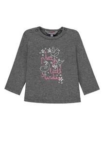 Prasować do 100C. Nie czyścić chemicznie. Opis producenta: Bluzka z długim rękawem dla dziewczynki w ciemnoszarym kolorze z nadrukiem z przodu. Rozpinana na ramionach na napy.
