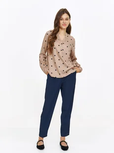 Bluzka damska Top Secret z zapięciem na trzy ozdobne guziki. Bluzka damska o pełnym luzu i swobody kroju z długim rękawem zakończonym wąskim mankietem z zapięciem na guzik. Została ona wykonana z przewiewnej oraz przyjemnej w dotyku dzianiny, będąc wzbogaconą o efektowny nadruk w grochy na całości. Uroku dodaje jej delikatny dekolt w kształcie litery V wraz z zapięciem z przodu na trzy ozdobne guziczki oraz efektownym kołnierzykiem na niewielkiej stójce. Ciekawie wygląda ona zarówno jako element niecodziennej stylizacji do pracy, jak i również na co dzień.