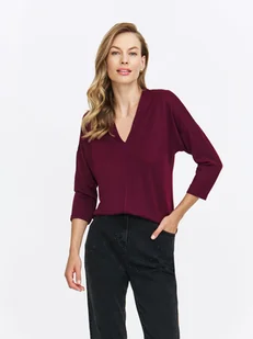 Bluzka damska dostępna w kolorze bordowym TSKW24BLK631631X00. Modelka ma 177 cm wzrostu i prezentuje rozmiar 34.